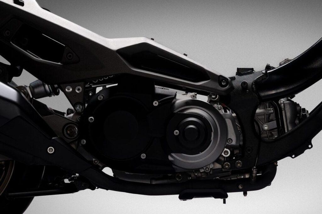 A foto vazada pela KYMCO mostra uma estrutura familiar: um quadro de alumínio com longarinas duplas e um motor bicilíndrico “deitado”, cujos cárteres revelam sua relação com a scooter desportiva AK 550. O nome “575” sugere uma nova versão deste motor com cilindrada ligeiramente maior, possivelmente superando os já generosos 50 cv da scooter de duas rodas.
