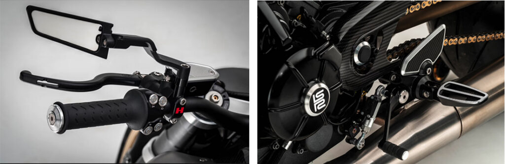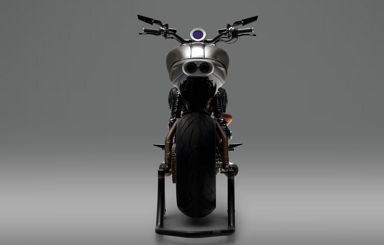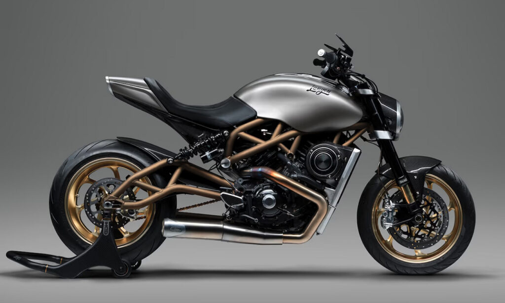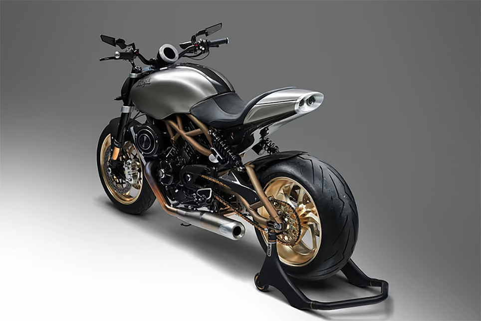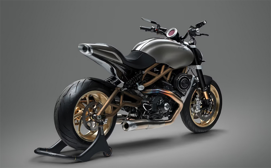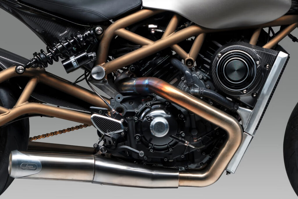 A potência vem de um motor V-twin de 1.190 cc refrigerado a líquido, alojado num chassis artesanal que combina uma estrutura espacial de aço de alta resistência com uma carroçaria em fibra de carbono.