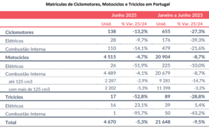 Em termos acumulados, de Janeiro a Junho de 2025, foram matriculados 21.648 veículos novos de duas e três rodas em Portugal, o que correspondeu a um decréscimo de 9,5 por cento em comparação com o mesmo período do ano de 2024. Quanto aos quadriciclos, estes apresentaram também uma diminuição de 9,7 por cento neste mesmo período face ao período homólogo do ano anterior.