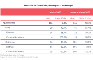 O mercado de quadriciclos, da categoria L, situou-se nas 106 unidades matriculadas em Março de 2025, o que representou uma queda de 9,4 por cento face a igual mês de 2024.