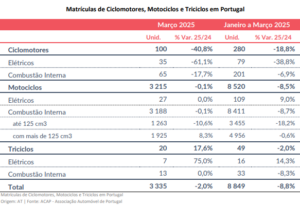 Em Março de 2025 o mercado de veículos novos de duas rodas e triciclos registou uma variação negativa de 2,0 por cento, face a Março de 2024, tendo sido matriculados 3.335 unidades. O mercado de quadriciclos da categoria europeia L registou também um decréscimo de 9,4 por cento face ao mesmo mês do ano anterior, tendo sido matriculados 106 veículos.