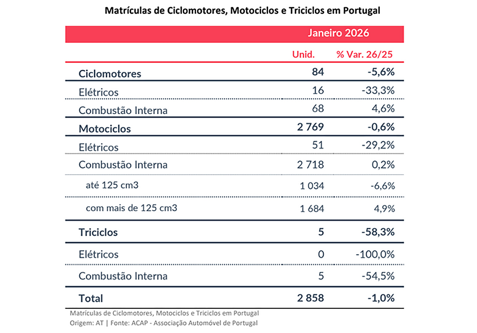 Os motociclos elétricos registaram, em Janeiro de 2026, um total de 51 unidades matriculadas em Portugal, o que representou um decréscimo de 29,2 por cento face ao mês homólogo do ano anterior. Os motociclos de cilindrada até 125 cm3 registaram, no primeiro mês do ano, um total de 1.034 unidades matriculadas em Portugal, o que representou uma queda de 6,6 por cento face ao mês homólogo de 2025.