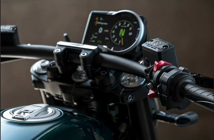 O contraste com as rodas raiadas, completamente pretas, torna a Nightshift notoriamente sofisticada. O visual Café Racer fica completo por um guiador plano de secção variável e espelhos retrovisores nas extremidades dos punhos.