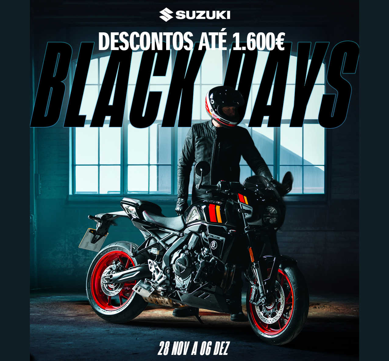 A Suzuki Portugal apresenta a nova campanha especial “Black Days Suzuki”, oferecendo uma oportunidade única para adquirir vários modelos da marca com descontos exclusivos que podem chegar aos 1.600€. De 28 de novembro a 06 de dezembro, será possível adquirir uma Suzuki com condições irresistíveis, sendo possível efetuar pré-reservas já a partir de 21 de novembro.