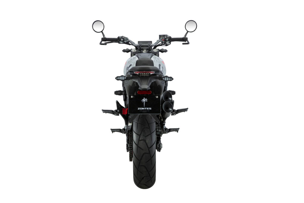 A ciclística também é generosa em termos de componentes, contando com uma forquilha invertida com bainhas de 43 mm e monoamortecedor traseiro com nitrogênio de alta pressão no sistema de amortecimento. Quanto aos travões, tem um disco dianteiro de 320 mm com pinça radial J.Juan à frente e um disco traseiro de 265 mm, além de ABS Bosch 9.1 M de dois canais. O braço oscilante é construído em alumínio fundido com nervuras visíveis.