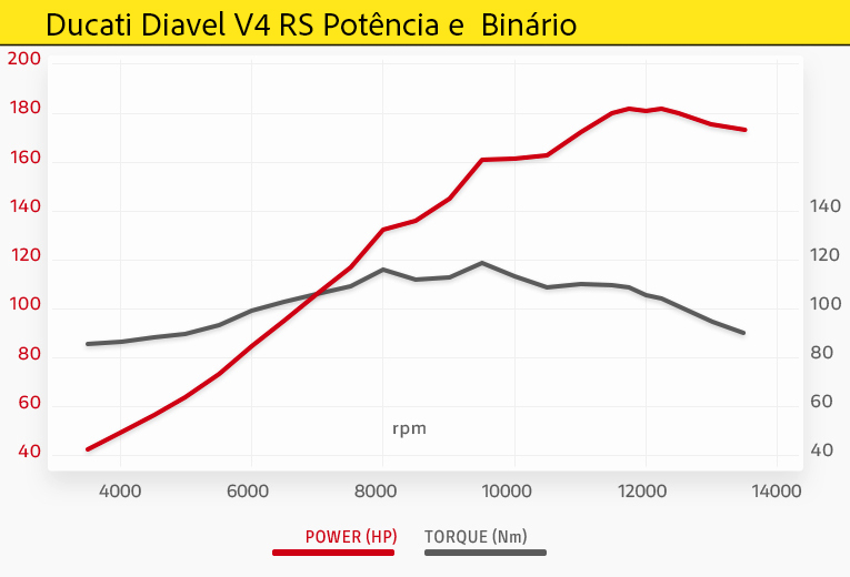 A potência declarada é de 182 cv – mais 14 cv do que o motor Granturismo utilizado noutras versões da Diavel.