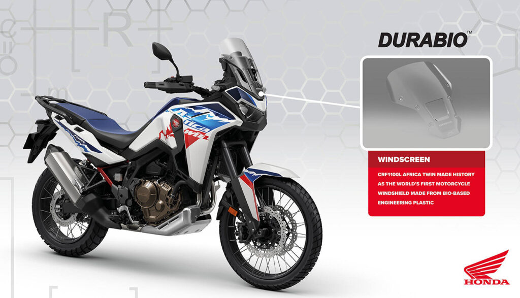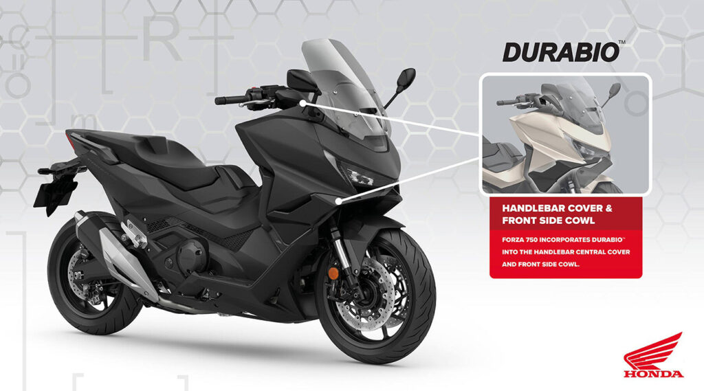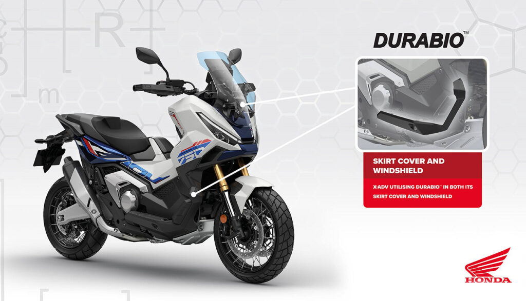 A Honda introduziu pela primeira vez o DURABIO™ no para-brisas da família CRF1100L Africa Twin, lançada em março de 2024. Este marco histórico representou o primeiro para-brisas de moto no mundo fabricado com plástico de engenharia de base biológica, sendo rapidamente seguido pela X-ADV, que passou a utilizar DURABIO™ tanto na cobertura inferior como no para-brisas. Ao mesmo tempo, foi incorporado na cobertura central do guiador e na carenagem frontal lateral da Forza 750, integrando-se perfeitamente graças ao acabamento de alta qualidade.