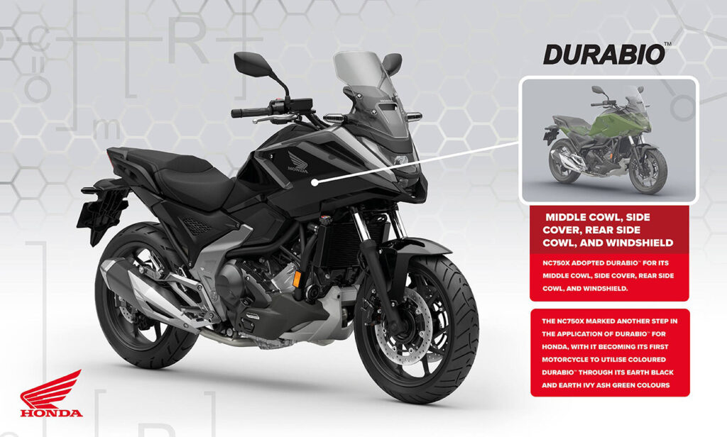 A NC750X marcou outro passo na aplicação do DURABIO™ na Honda, tornando-se a primeira moto a utilizar DURABIO™ colorido na estrutura, nas opções Earth Black e Earth Ivy Ash Green.