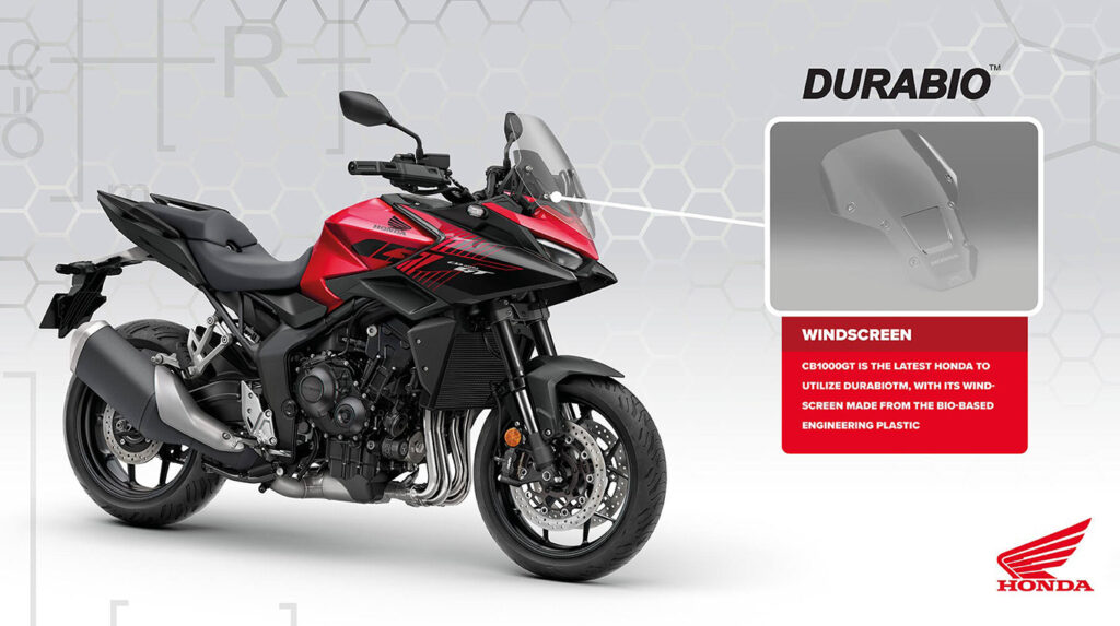 A CB1000GT 2026, apresentada na EICMA de 2025, é o modelo mais recente a incluir um componente em DURABIO™, com o seu para-brisas fabricado neste material.