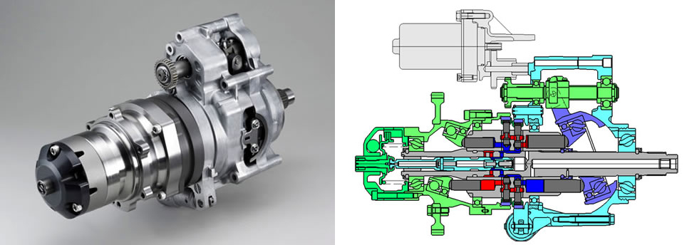 Quando o prato oscilante estava paralelo à bomba, os pistões não se moviam, pelo que não impulsionavam fluido hidráulico pelo sistema, mas à medida que o ângulo aumentava, o curso dos pistões também aumentava, elevando a quantidade de fluido bombeada para o motor hidráulico na roda traseira.